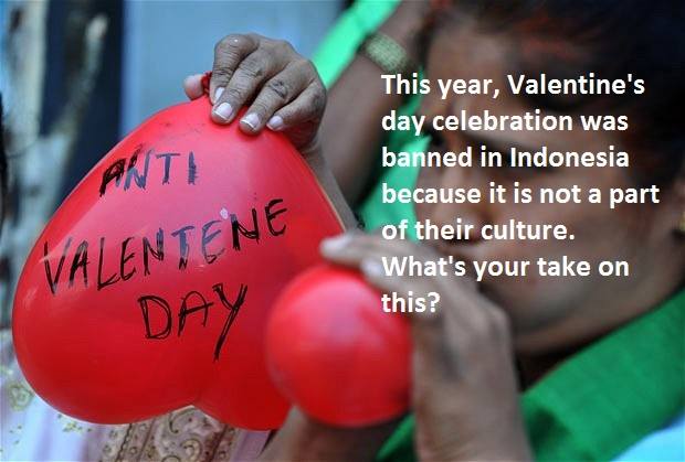 His Answer: The Version of Valentines day we normally see is very Commercial and Market Oriented, Putting a ban On Valentine day celebration, Indonesia attempted to save their people from being subject to a celebration which is brought to limelight by marketing geniuses, they (Indonesia) vouched for protection of their culture from inclination to the narrow celebration of love on a particular day. love has no barriers but at the same time a private feeling of two souls which can be celebrated on any day rather every single day of the year. I am sure Indonesian government won’t Mind if two people are enjoying times together any day than just showing the market induced love on a particular day.